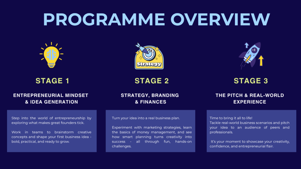 Every activity is interactive and fast-paced, blending creativity, teamwork, and strategy. Students experiment with marketing, explore finance basics, and present to a live audience, all while learning directly from inspiring guest mentors and industry professionals.
